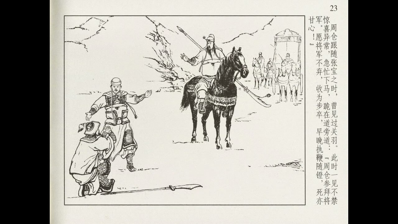 Quan Công thúc ngựa đi trước, Huyền Đức đi sau, đi tắt đến núi Ngoạ Ngưu. Châu Thương đến đứng dưới núi, mắng chửi, tướng ấy mặc áo giáp, vác giáo tế ngựa đem quân xuống núi.