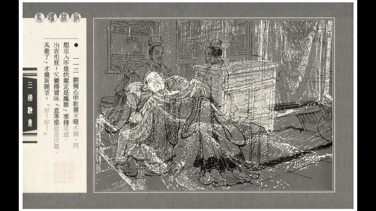 Liền sai tiểu đồng làm cơm khoản đãi, dắt ngựa vào tàu. Huyền Đức ăn uống xong, vào nghỉ ở gian phòng bên cạnh; đêm nằm nghĩ lời Thuỷ Kính, trằn trọc mãi không ngủ được. Tới khuya, bỗng có tiếng người gõ cửa phòng giữa, đi vào, rồi nghe tiếng Thuỷ Kính hỏi: