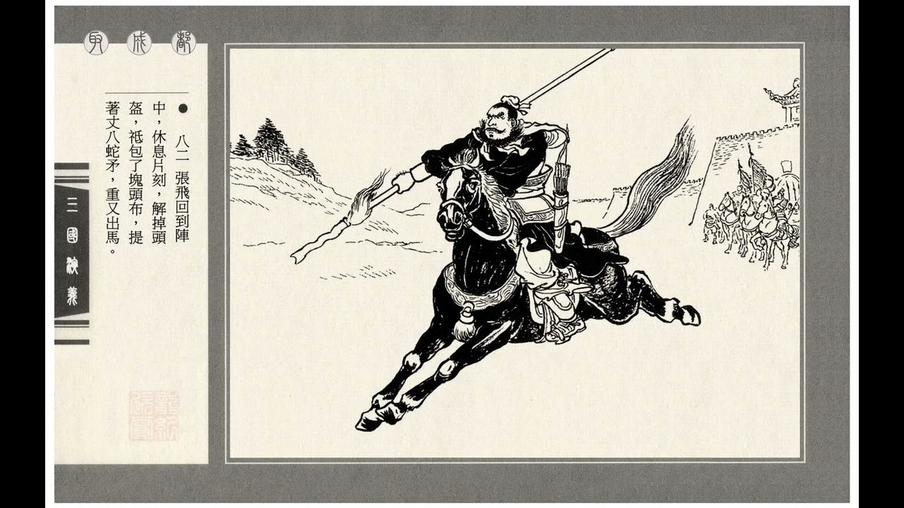 Trương Phi về đến trại, nghỉ ngựa một lát, rồi chỉ quàng cái khăn bịt tóc, lên ngựa lại ra trận gọi đánh.