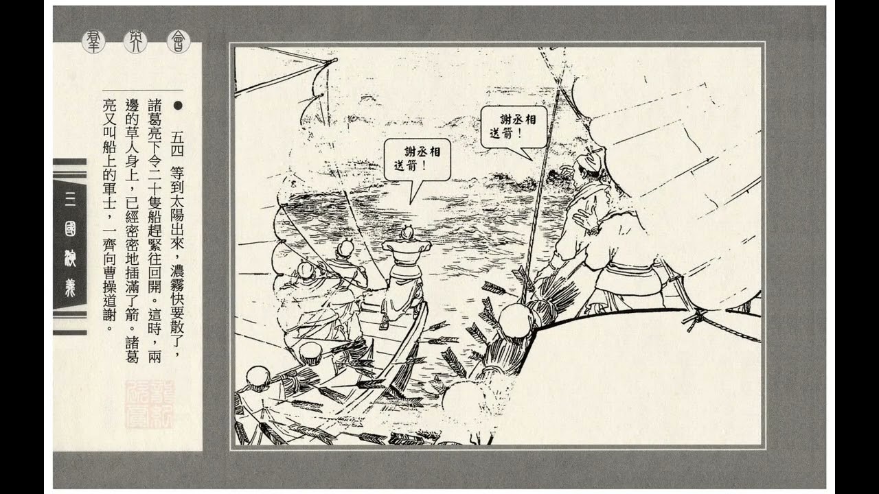 Khổng Minh một mặt lại sai quay mũi thuyền về phía tây, áp vào trại thuỷ đỡ lấy tên; một mặt vẫn cứ thúc trống hò reo ầm ĩ.